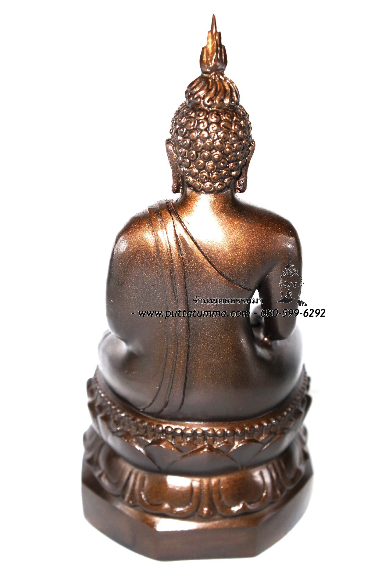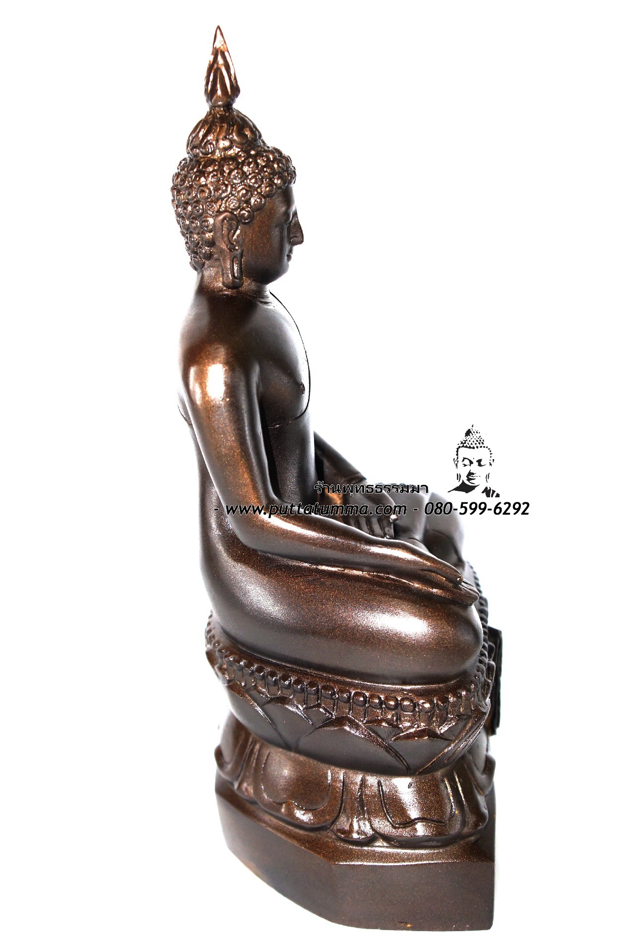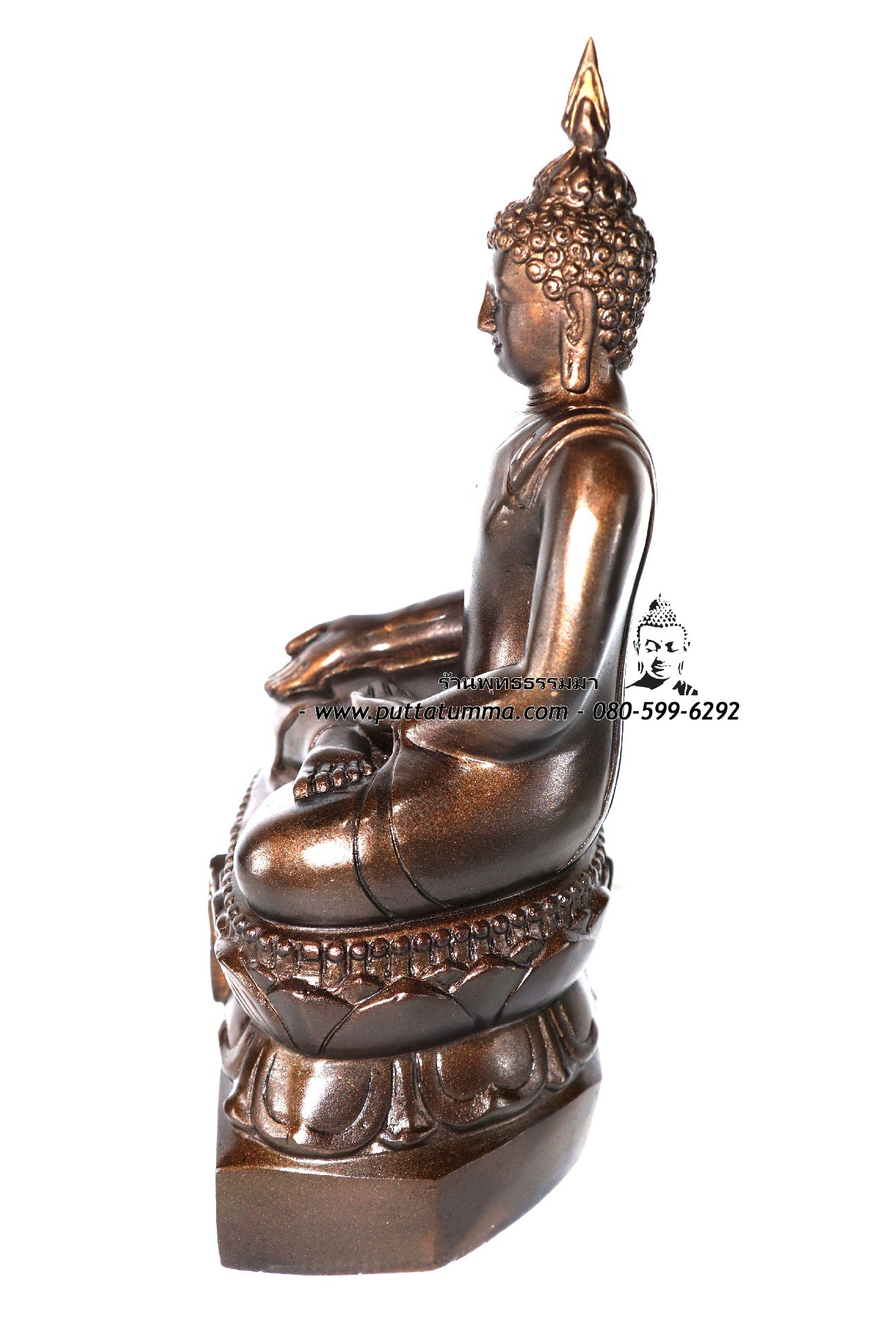 รูปลักษณะ : นั่งขัดสมาธิเพชร ในท่าวางมือขวาแบหงายขึ้น